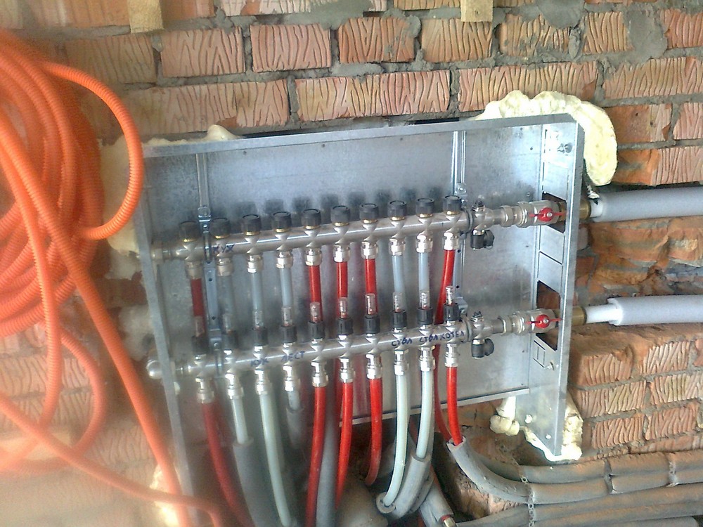 Первым делом монтируют коллекторный шкаф внутри, которого происходит стыковка труб, а также размещаются некоторые элементы регулировки. После установки шкафа в него заводят трубы подающую и возвратную, устанавливают запорную арматуру, сливной кран и воздухоотводчик.